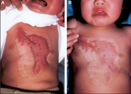 尽管目前对伤口愈合及胶原代谢的研究有很大的进展,但瘢痕仍难以预防、治疗和根除。一般认为,创伤深及真皮深层则会导致瘢痕,严重者发生瘢痕增生,瘢痕疙瘩。增生性瘢痕多在手术及外伤后数月内发生,可以位于任何部位,但前胸、上背及三角肌区尤其容易发生。呈粉红色,坚硬,高出皮面,条索状。瘢痕疙瘩呈现红色或紫色,为高出皮面的坚硬的结节状,超出原受伤部位向正常皮肤呈侵袭性和浸润样生长。